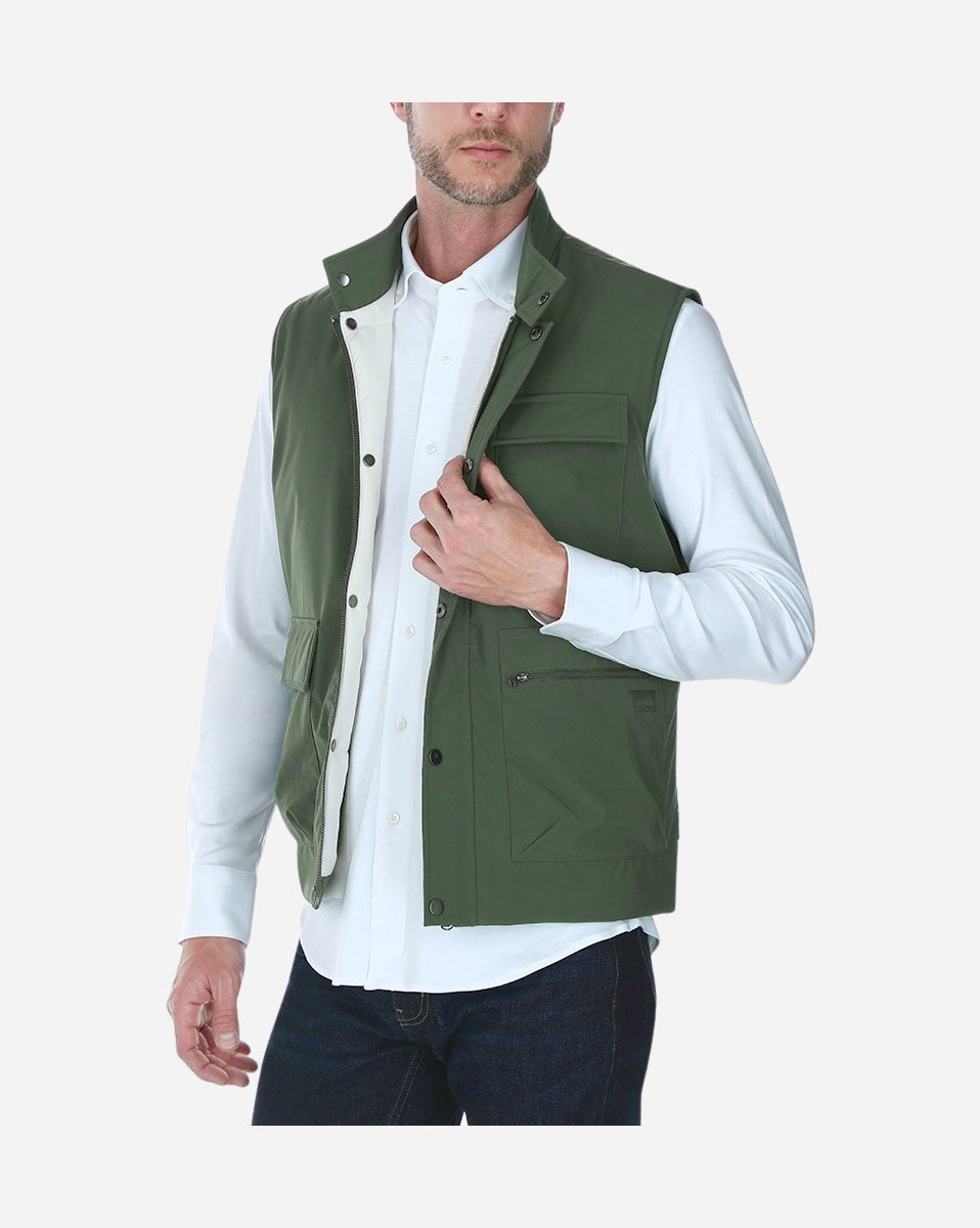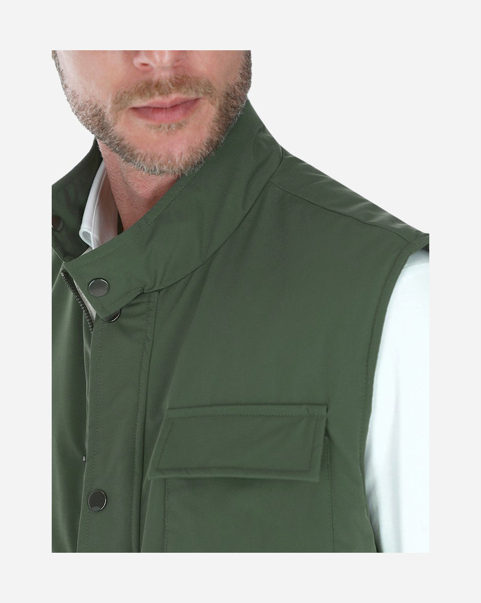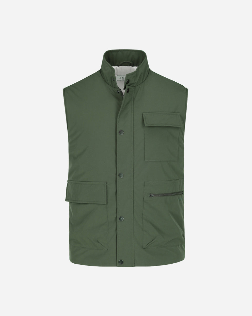 Chaleco 92% poliéster, 8% spandex, regular fit. Cuello alto y bolsas asimétricas al frente que combinan cierres y solapas, ofreciendo estilo y practicidad. Ideal para un look casual con inspiración utilitaria.