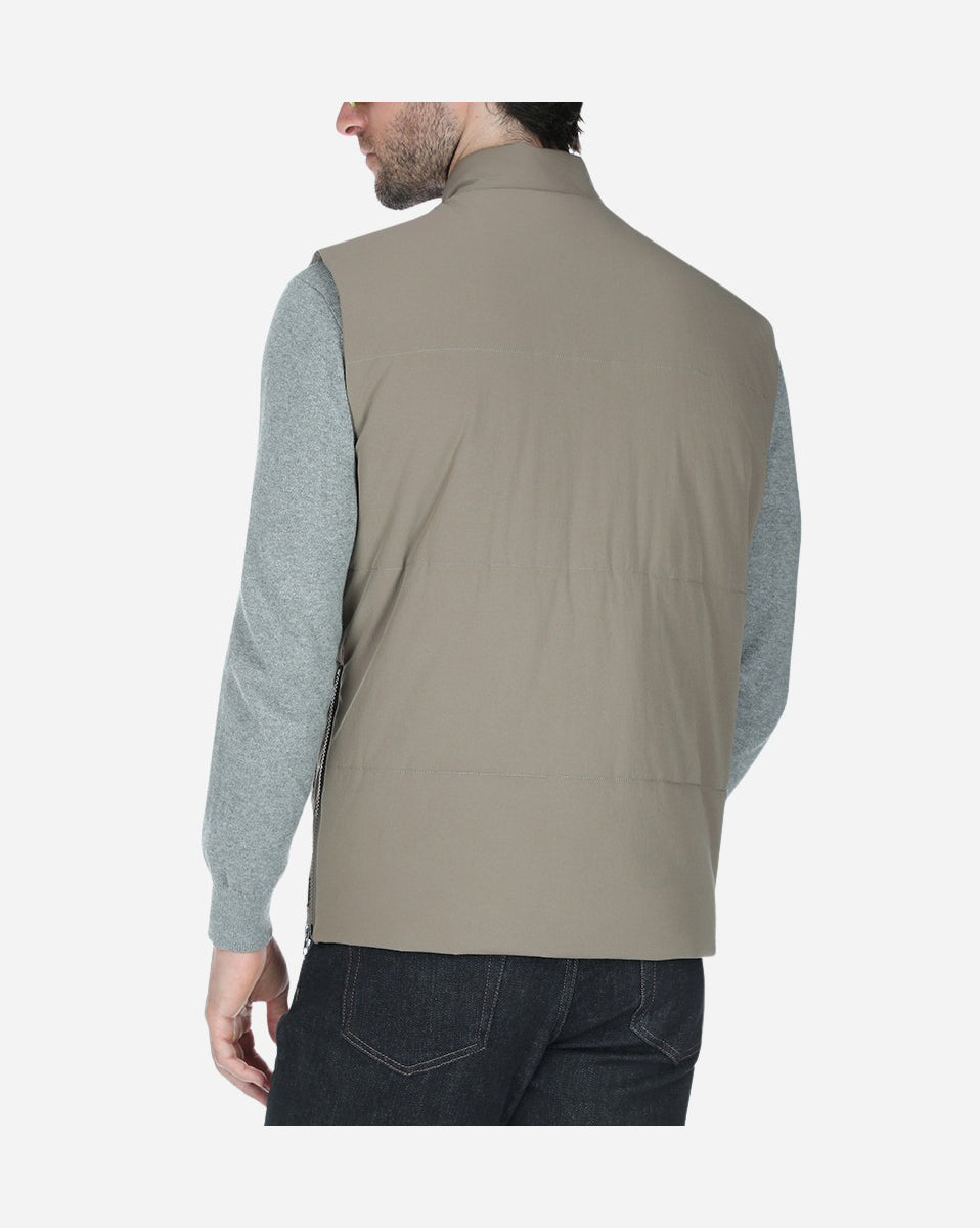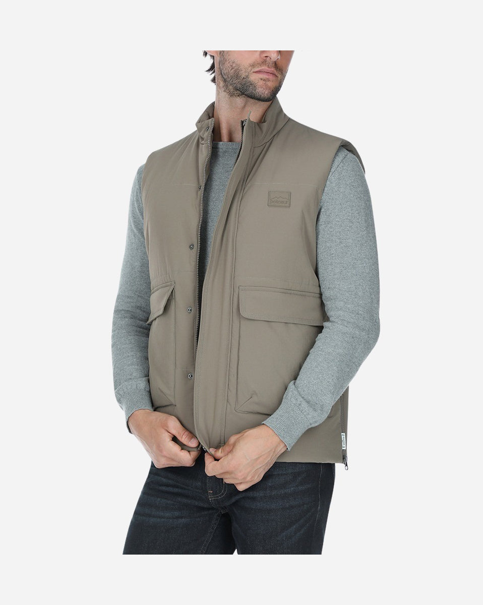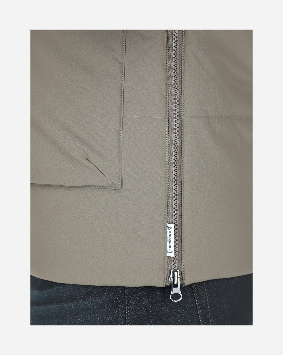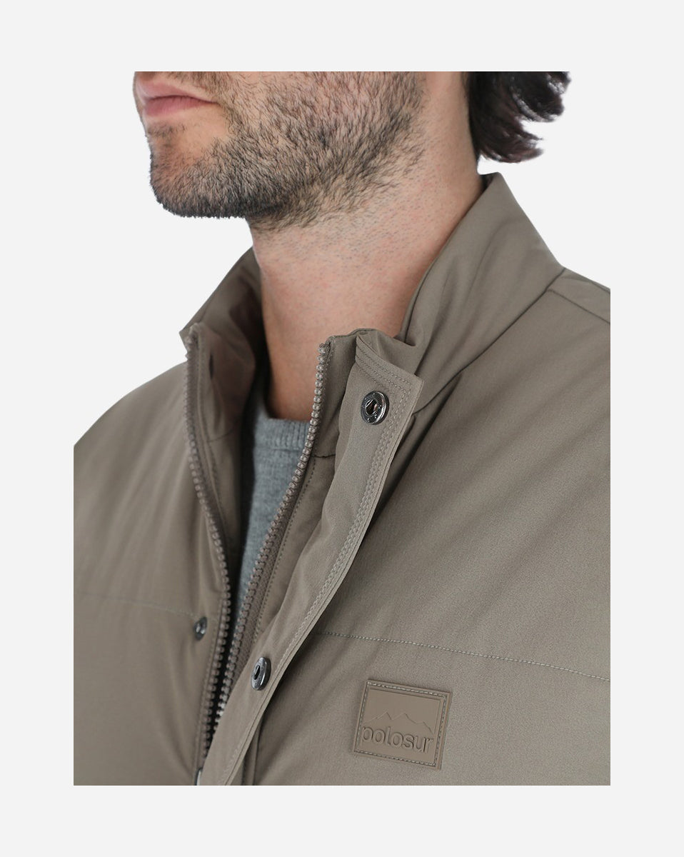 Chaleco con bolsas 90% Nylon y 10% spandex, color beige oscuro con diseño funcional y estilo utilitario. Cuello alto y amplias bolsas frontales con solapa, ideales para mayor practicidad. Su confección acolchada lo hace perfecto para los días frescos, combinando abrigo y comodidad.