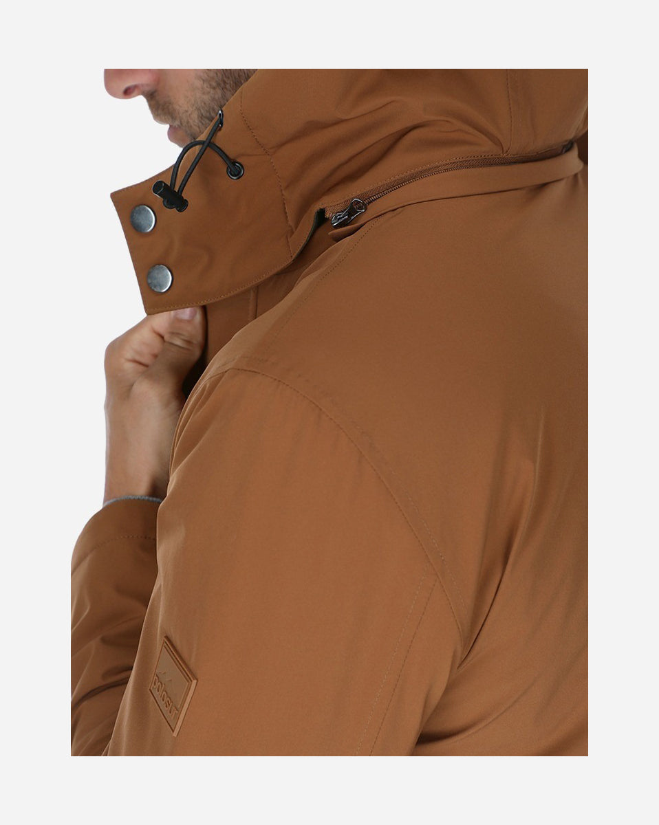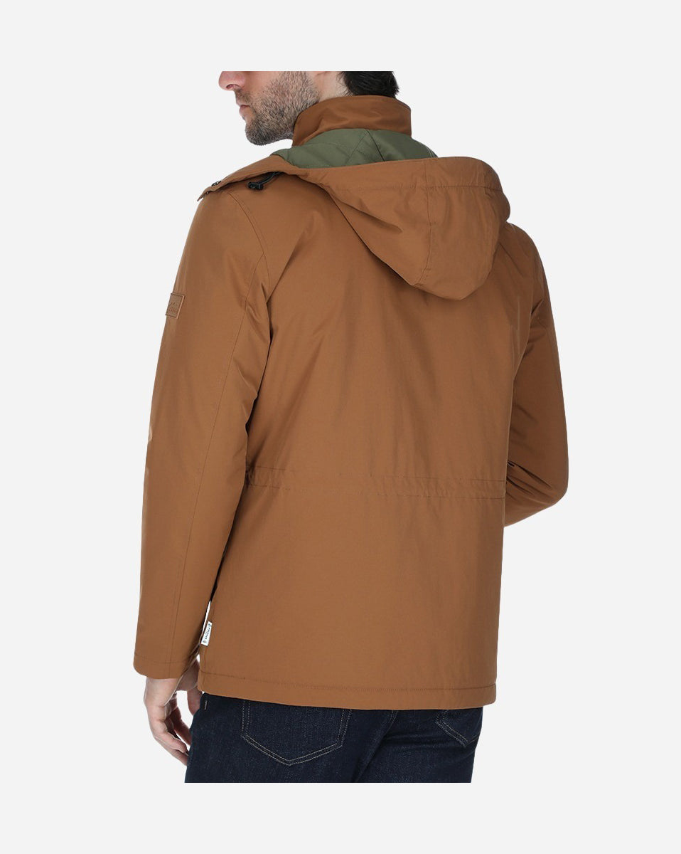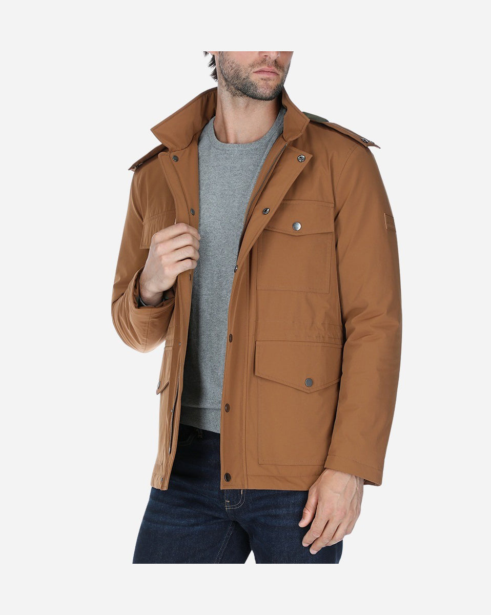 Chamarra Regular Fit 100% poliéster. Diseño funcional y estilo utilitario, en color ocre. Cuenta con múltiples bolsas al frente con solapa y una capucha desmontable, ajuste en la parte de la cintura interna, capitonado interno en contraste. Corte y confección que brindan protección, comodidad y practicidad para el día a día.