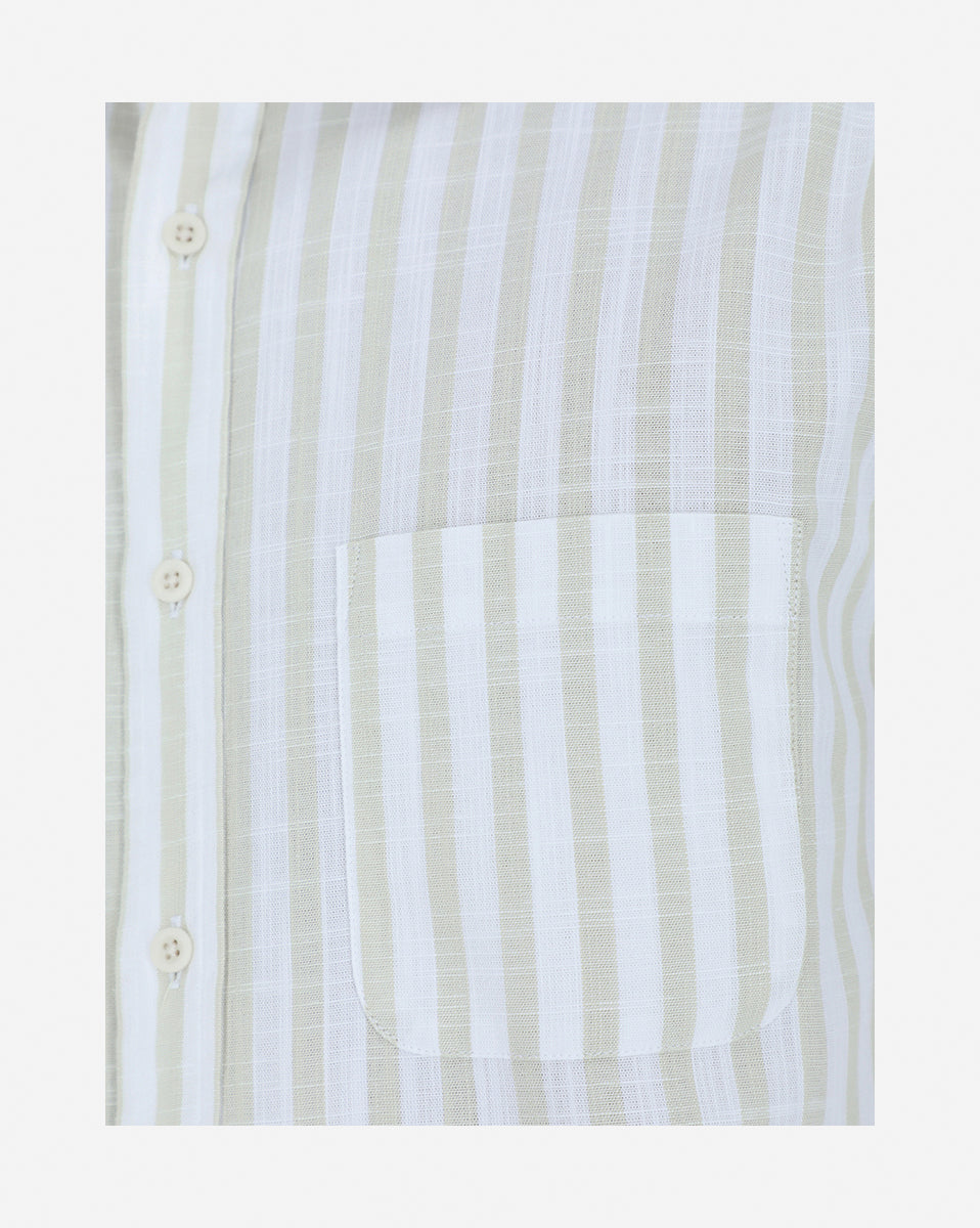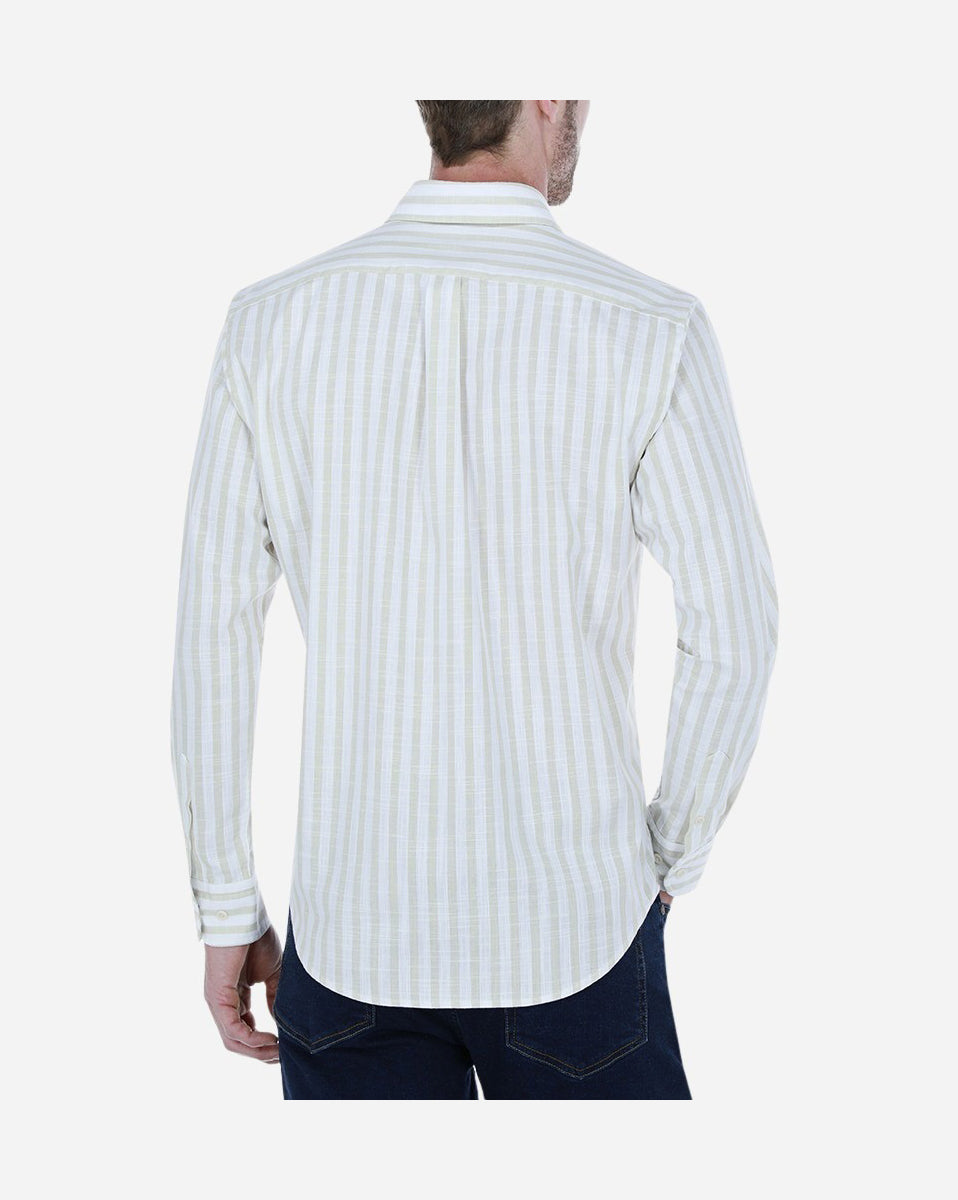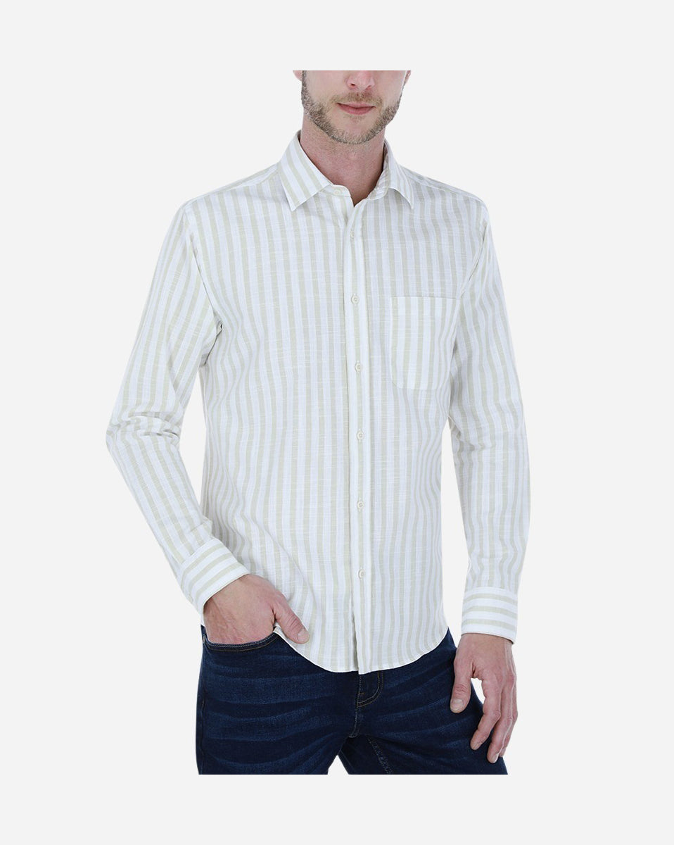Camisa casual regular fit 100% algodón en slub. Tejido suave, fresco y de apariencia similar al lino. Cuello francés, manga larga, puño con terminación redonda, espalda con tablón central y bolsa en pecho con esquinas redondas.