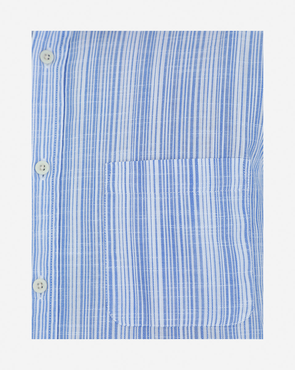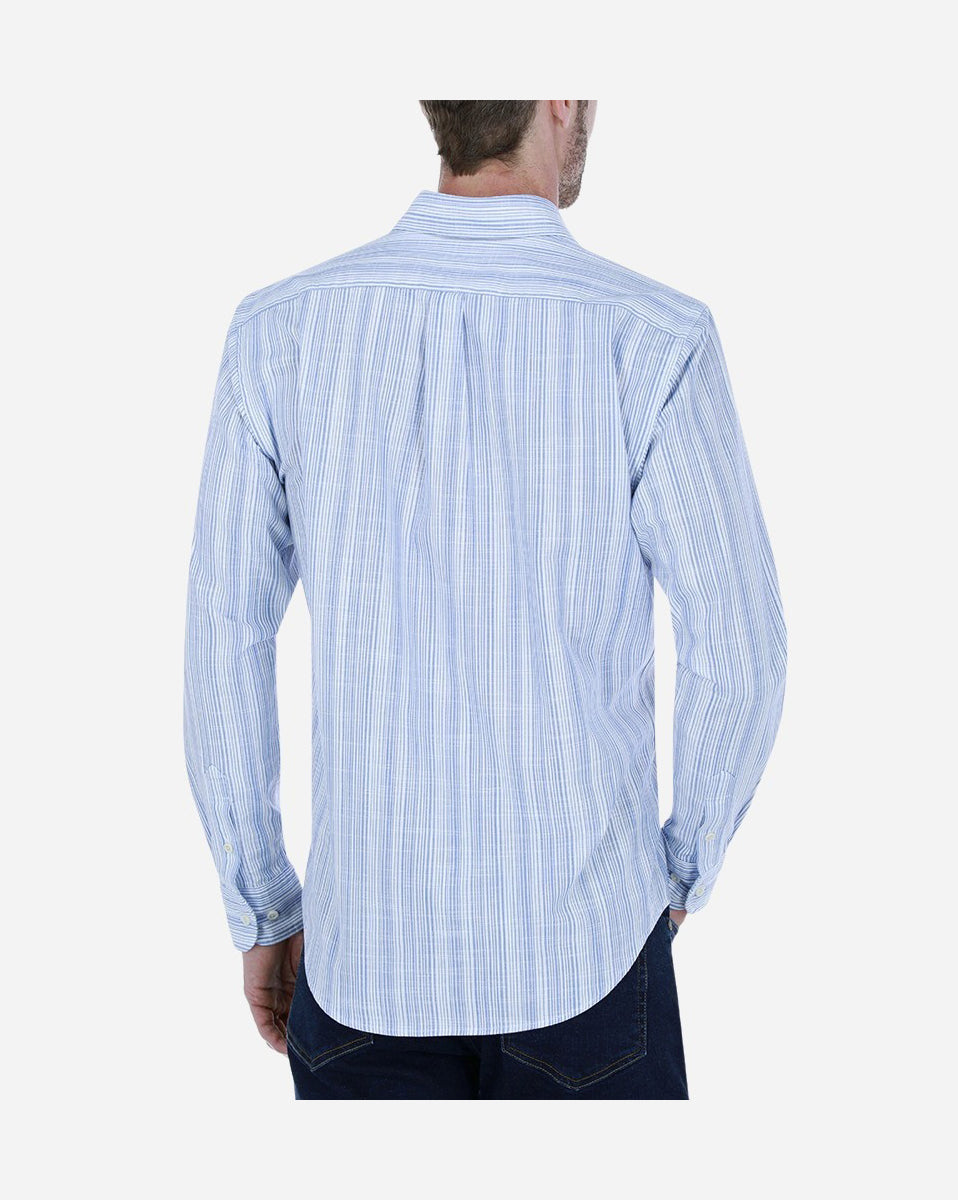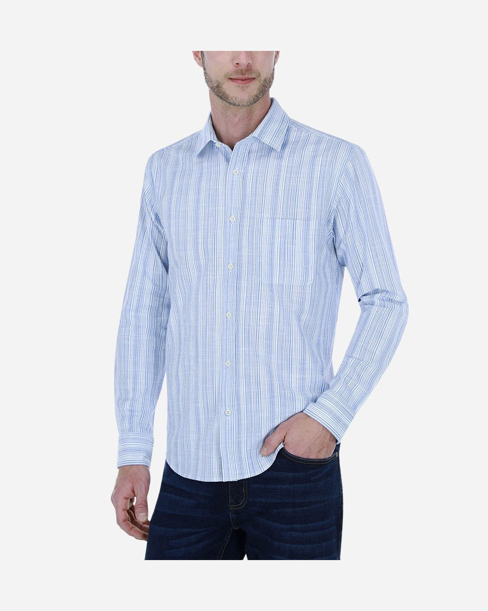 Camisa casual regular fit 100% algodón en slub. Tejido suave, fresco y de apariencia similar al lino. Cuello bari con button down, manga larga, puño con terminación redonda, espalda con tablón central y bolsa en pecho con esquinas redondas.