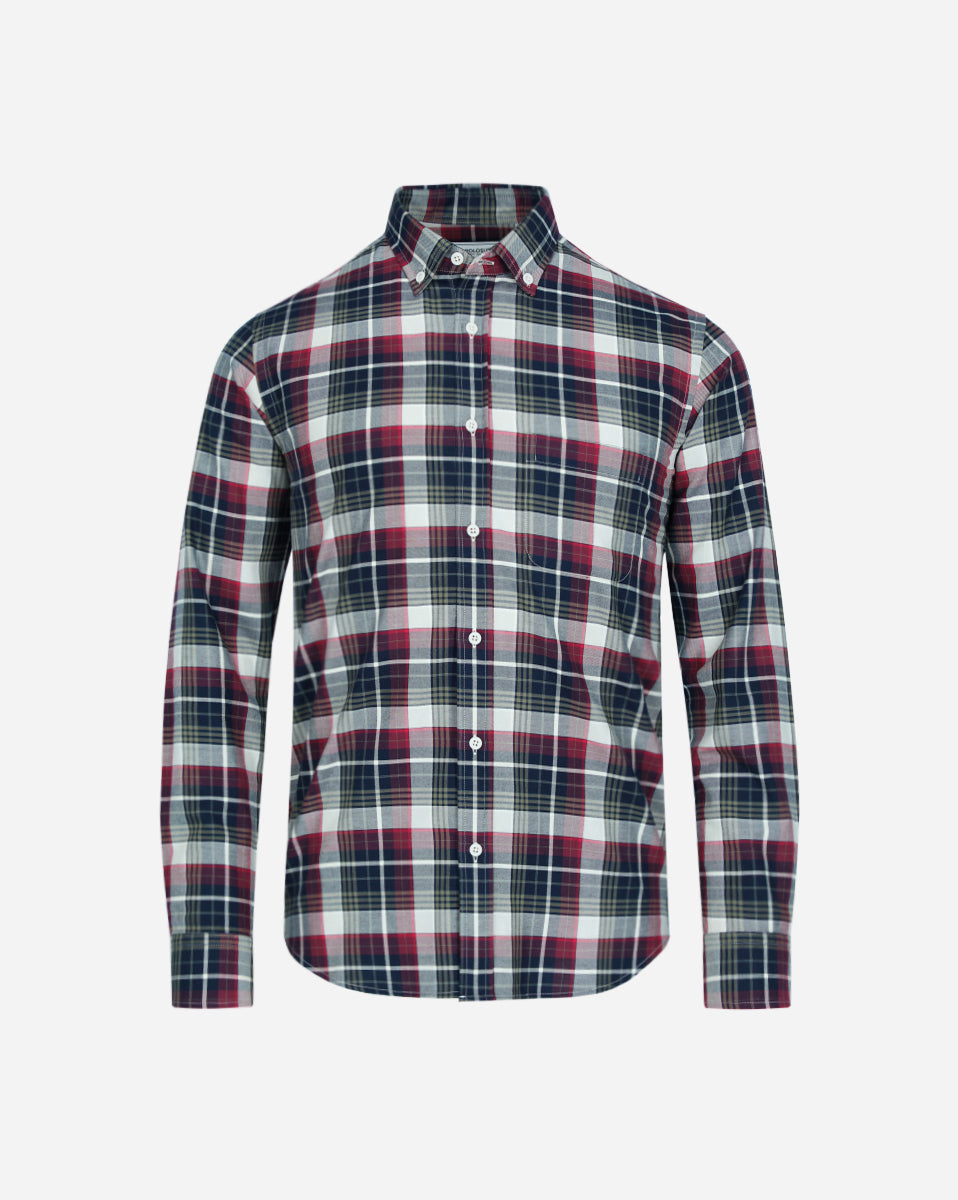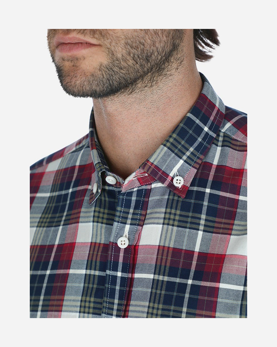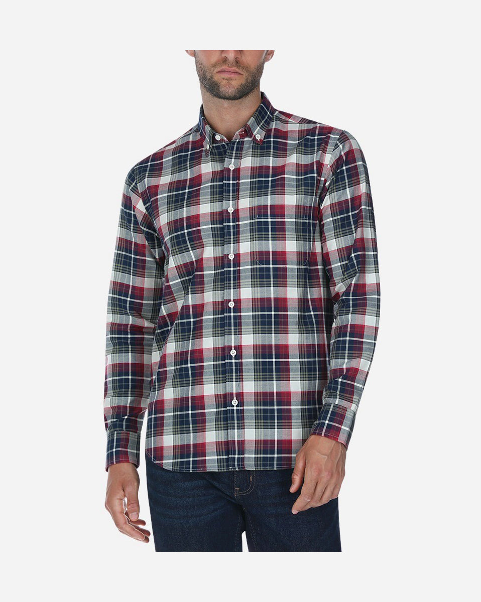 Camisa sport Polo sur 100% algodón, manga larga, en tejido twill con diseño de cuadros en color rojo como base, con contraste en marino, beige y gris. Cuenta con cuello Baricon botón (button down), puño redondo con doble botón y bolsa al frente con esquinas redondeadas. Los botones tienen acabado engomado y se incluye botón de repuesto en la parte inferior de la aletilla.