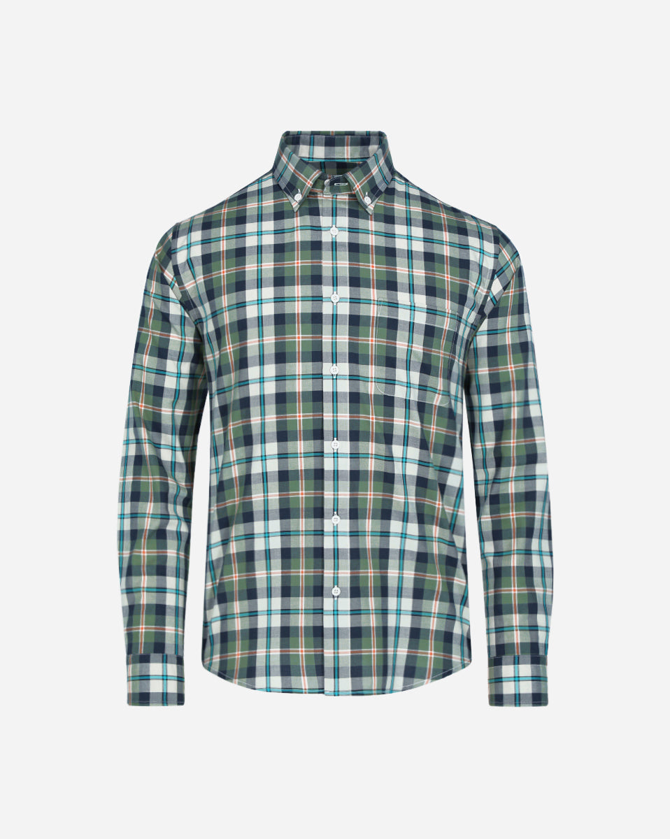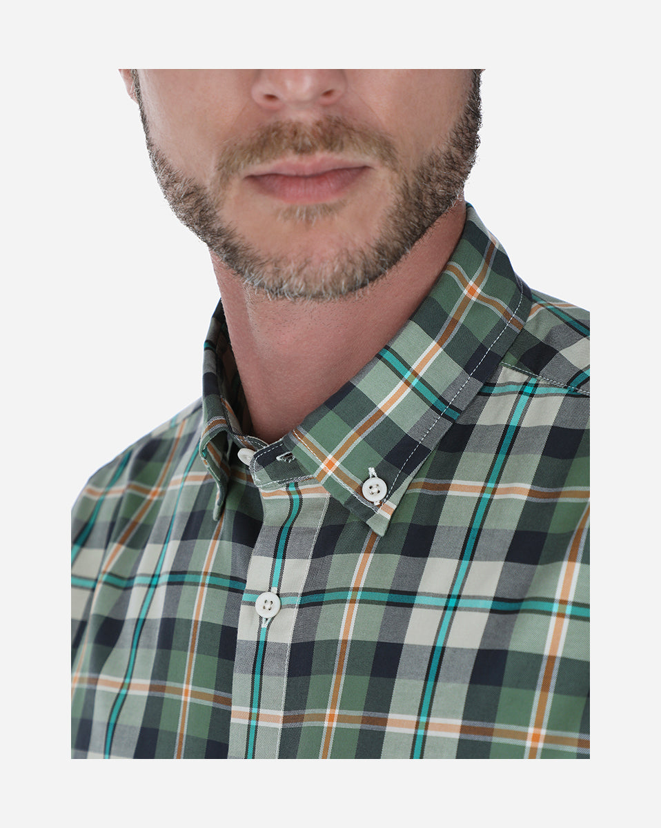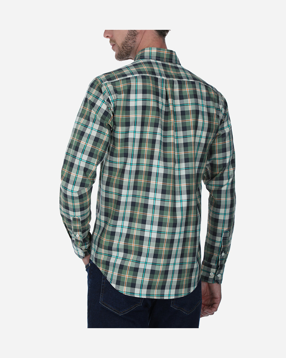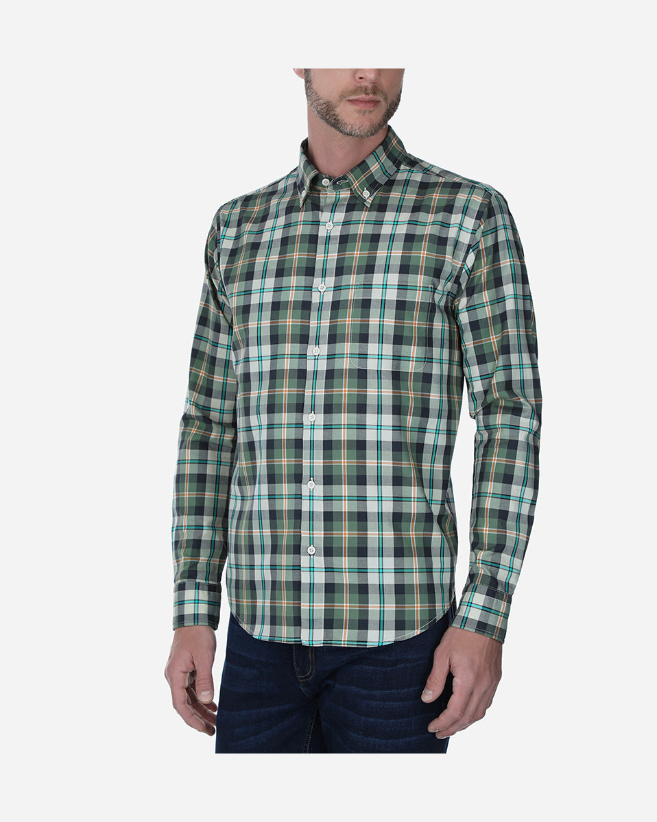 Camisa sport Polo sur 100% algodón, manga larga, confeccionada en tejido Panamá en color olivo. Cuenta con cuello Bari con botón (button down), puño redondo con doble botón y bolsa al frente con esquinas redondeadas. Los botones tienen acabado engomado y se incluye botón de repuesto en la parte inferior de la aletilla.