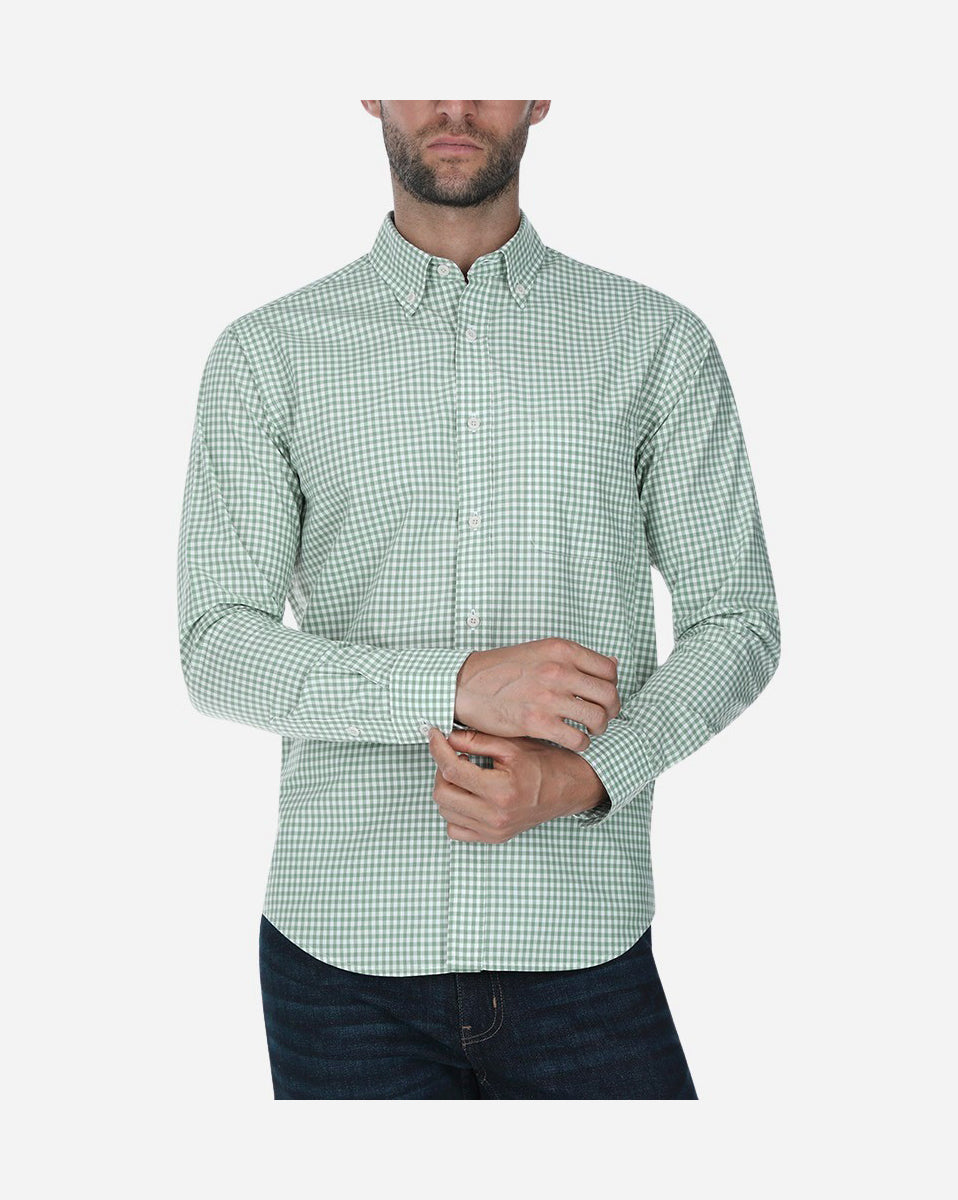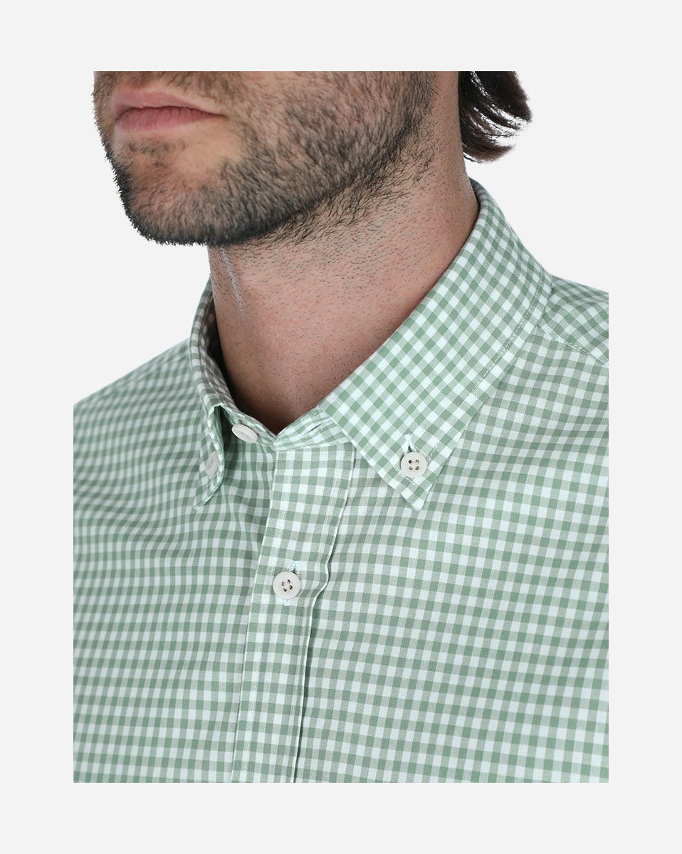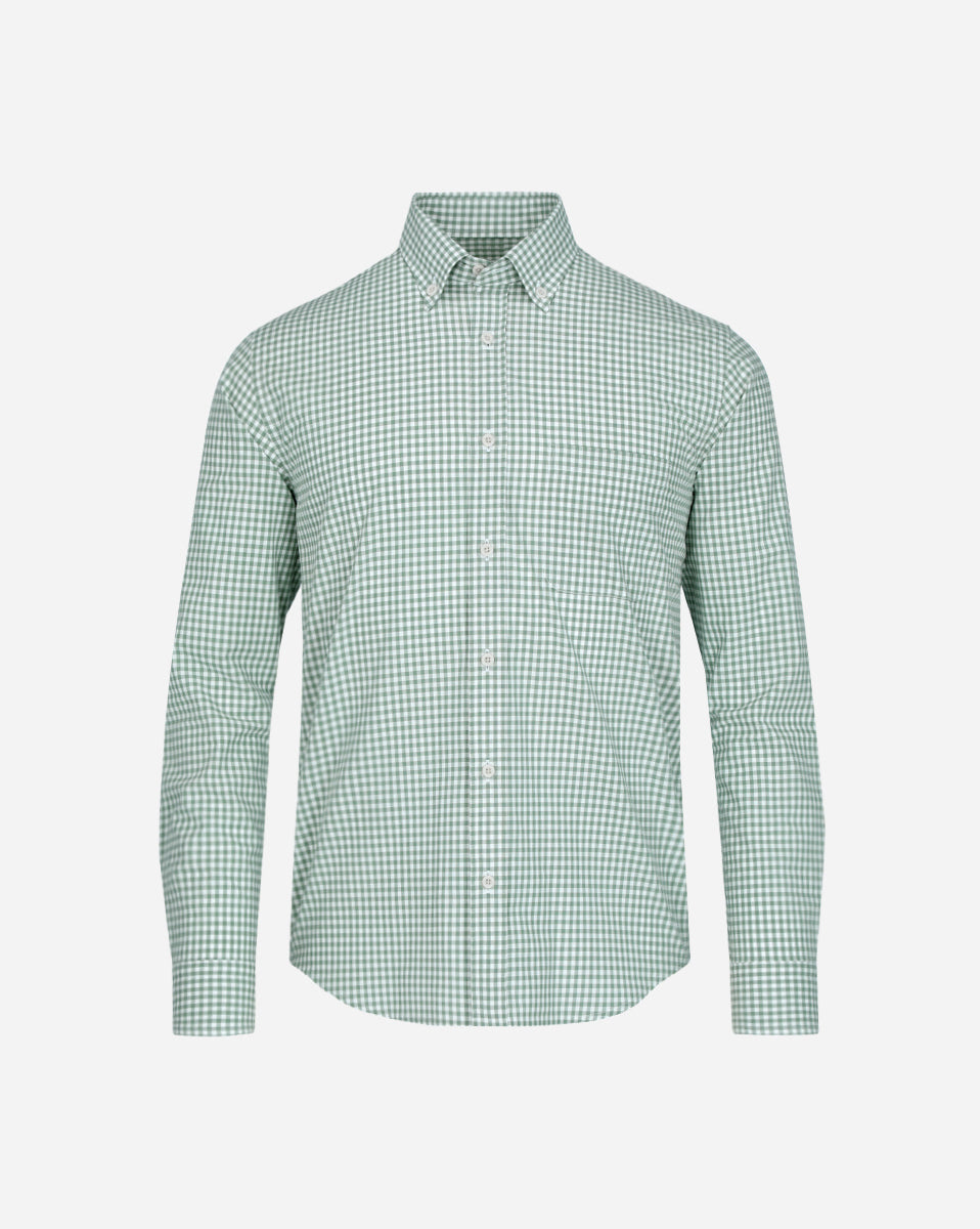 Camisa sport Polo sur 100% algodón, manga larga, en tejido popelina con diseño de cuadros en color verde claro como base. Cuenta con cuello Bari con botón (button down), puño redondo con doble botón y bolsa al frente con esquinas redondeadas. Los botones tienen acabado engomado y se incluye botón de repuesto en la parte inferior de la aletilla.