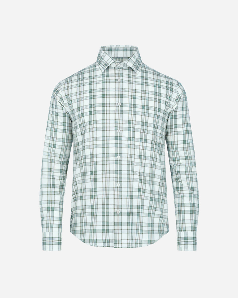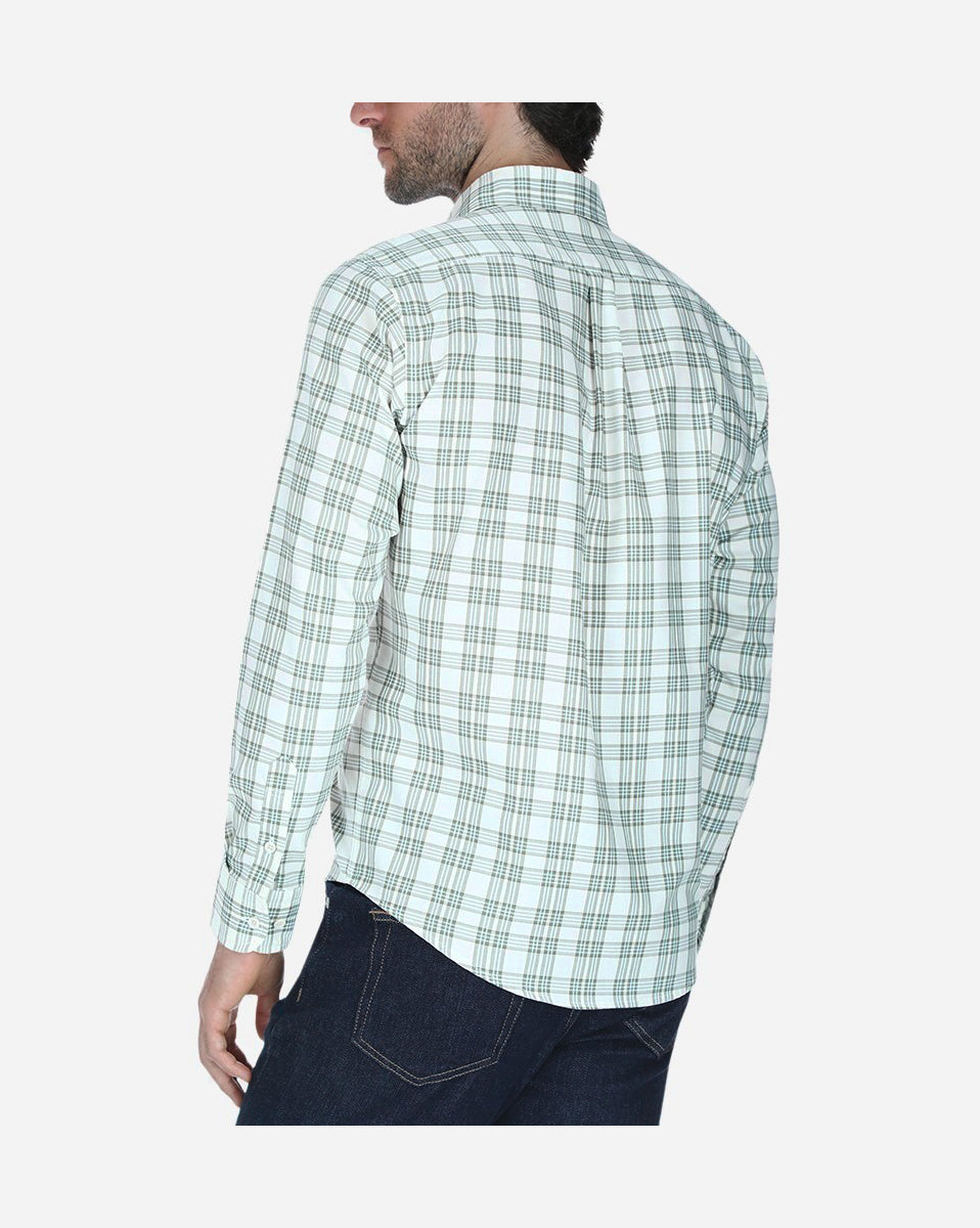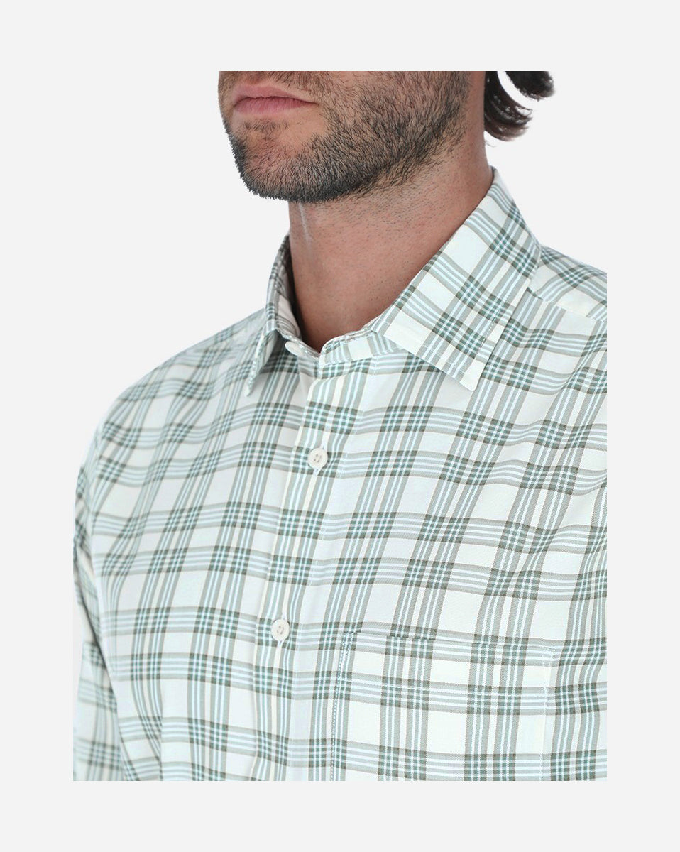 Camisa sport Polo sur 100% algodón, manga larga, en tejido Panamá con diseño de cuadros en color olivo sobre base clara. Cuenta con cuello francés sin varilla, puño redondo con doble botón y bolsa al frente con esquinas redondeadas. Los botones tienen acabado engomado y se incluye botón de repuesto en la parte inferior de la aletilla.