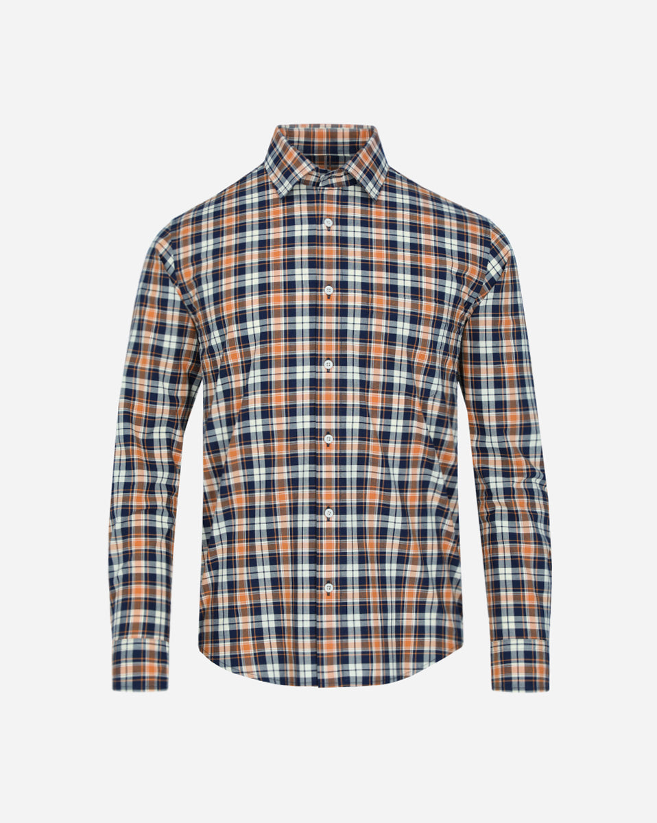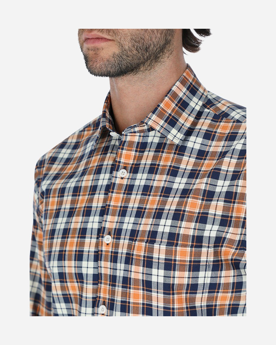 Camisa sport Polo sur 100% algodón, manga larga, en tejido popelina con diseño de cuadros en color naranja como base, con acentos en marino y beige. Cuenta con cuello francés sin varilla, puño redondo con doble botón y bolsa al frente con esquinas redondeadas. Los botones tienen acabado engomado y se incluye botón de repuesto en la parte inferior de la aletilla.