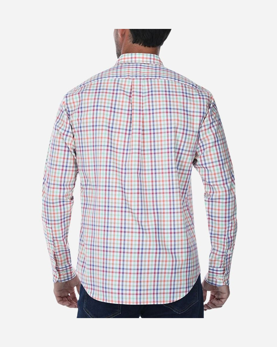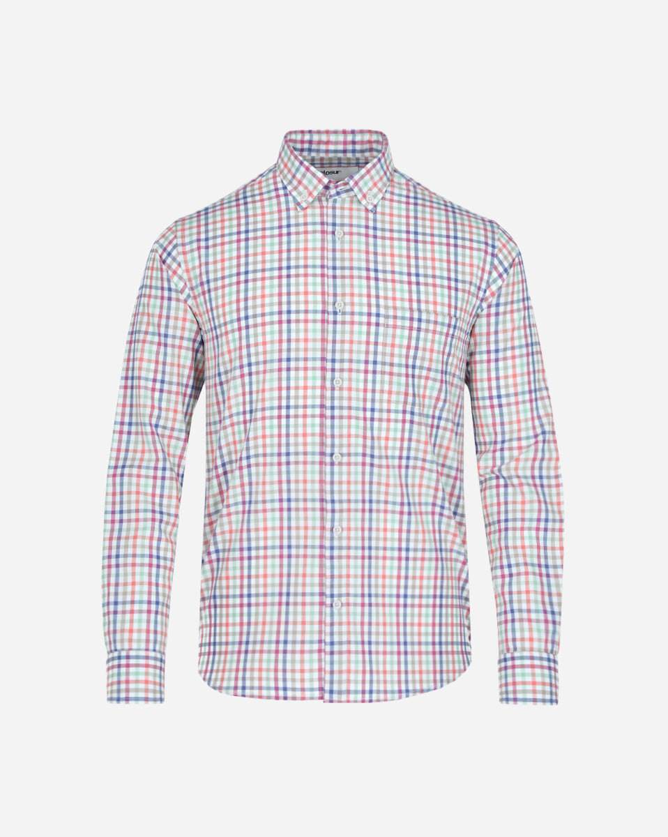 Camisa sport 100% algodón, manga larga, en color rosa medio con diseño de cuadros. Confeccionada en tejido panama, que aporta frescura, textura y una estructura ligera ideal para uso diario. Presenta cuello Bari con botón (button down), puño redondo con doble botón y bolsa al frente con esquinas redondeadas. Los botones tienen acabado engomado y se incluye botón de repuesto en la parte inferior de la aletilla.