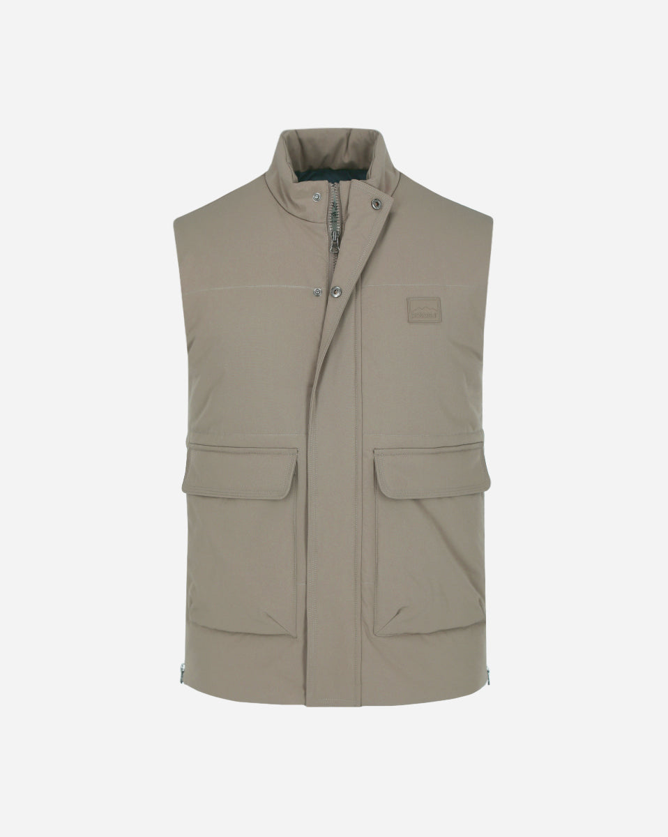 Chaleco con bolsas 90% Nylon y 10% spandex, color beige oscuro con diseño funcional y estilo utilitario. Cuello alto y amplias bolsas frontales con solapa, ideales para mayor practicidad. Su confección acolchada lo hace perfecto para los días frescos, combinando abrigo y comodidad.
