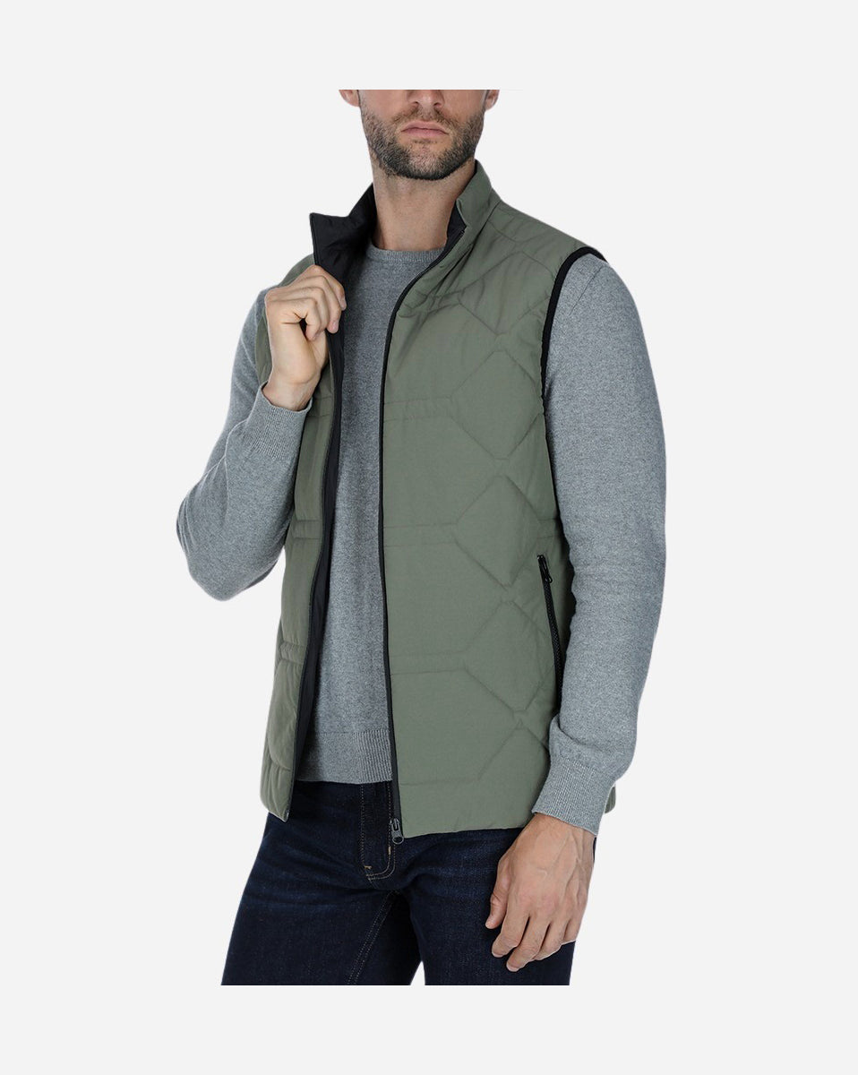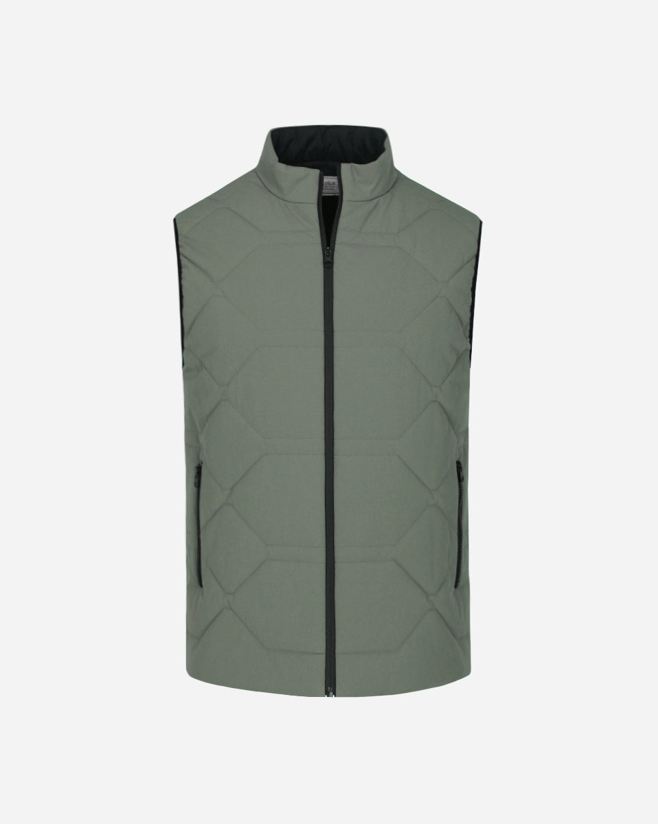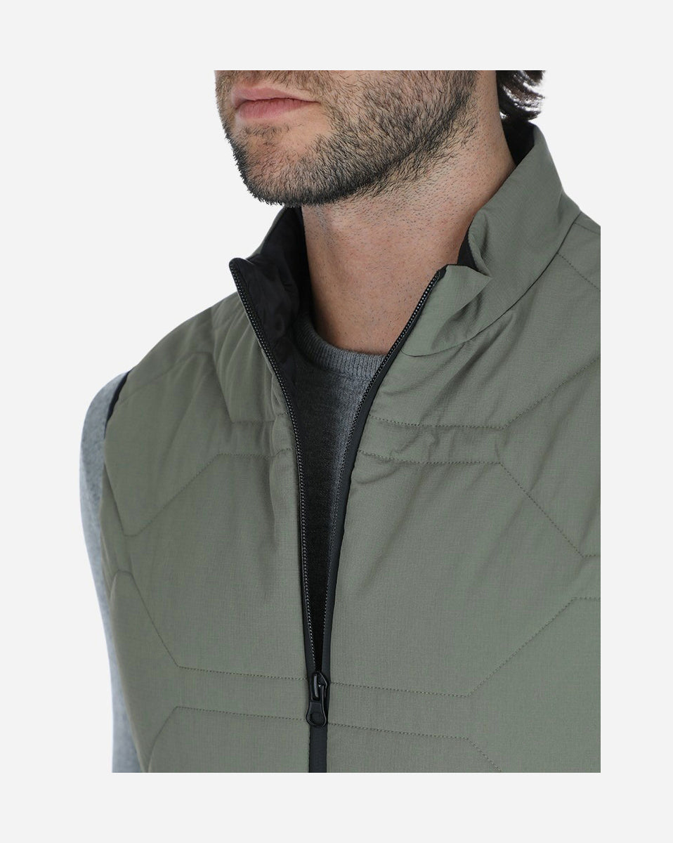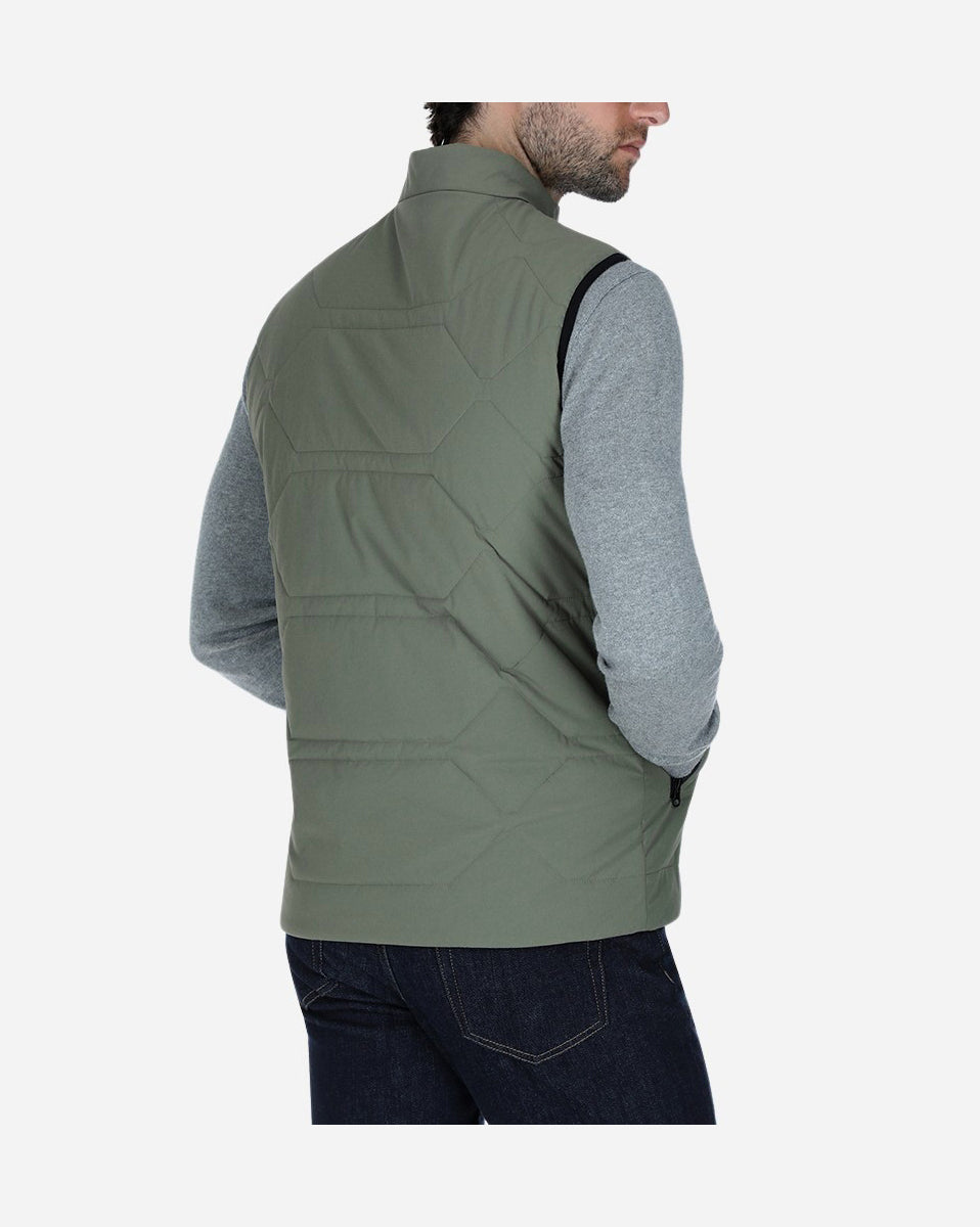 Chaleco 100% poliéster en color olivo con diseño capitonado en patrón de rombos. Cuenta con cierre frontal y bolsillos verticales con cierre, ofreciendo funcionalidad y estilo. Ideal para un look urbano y práctico durante los días frescos.