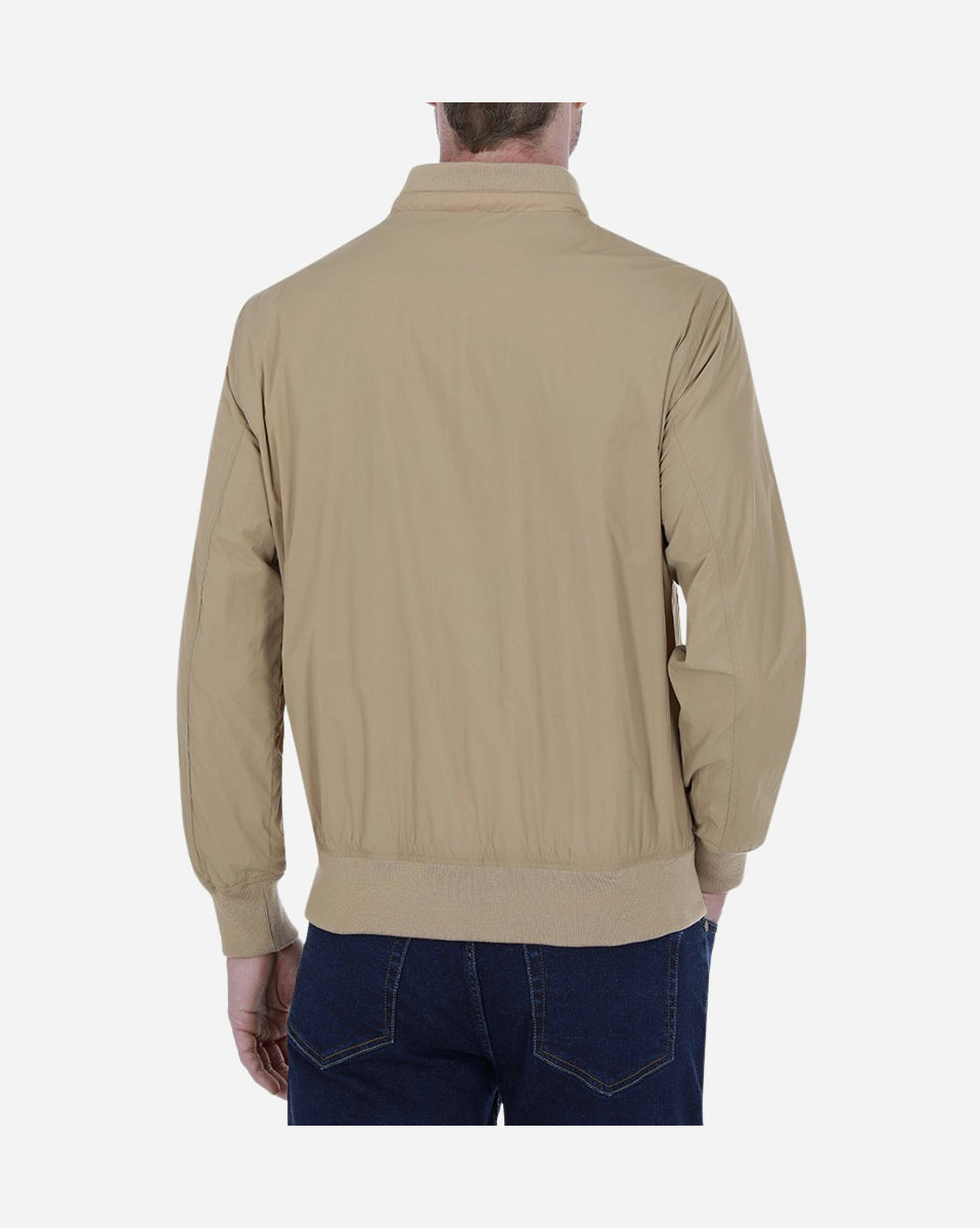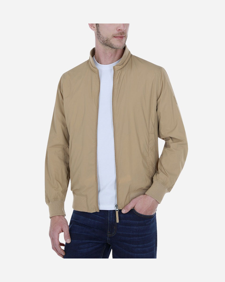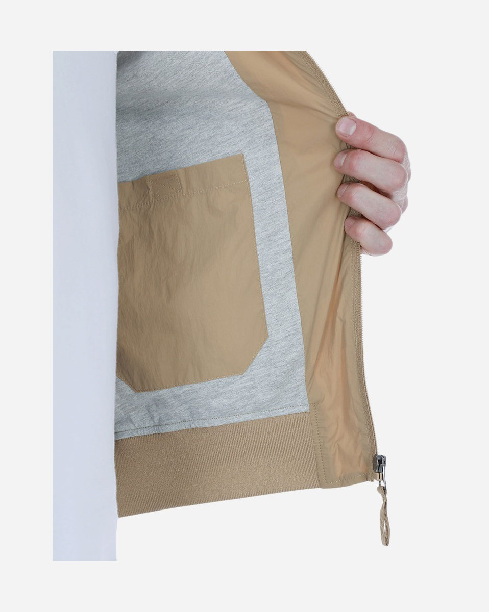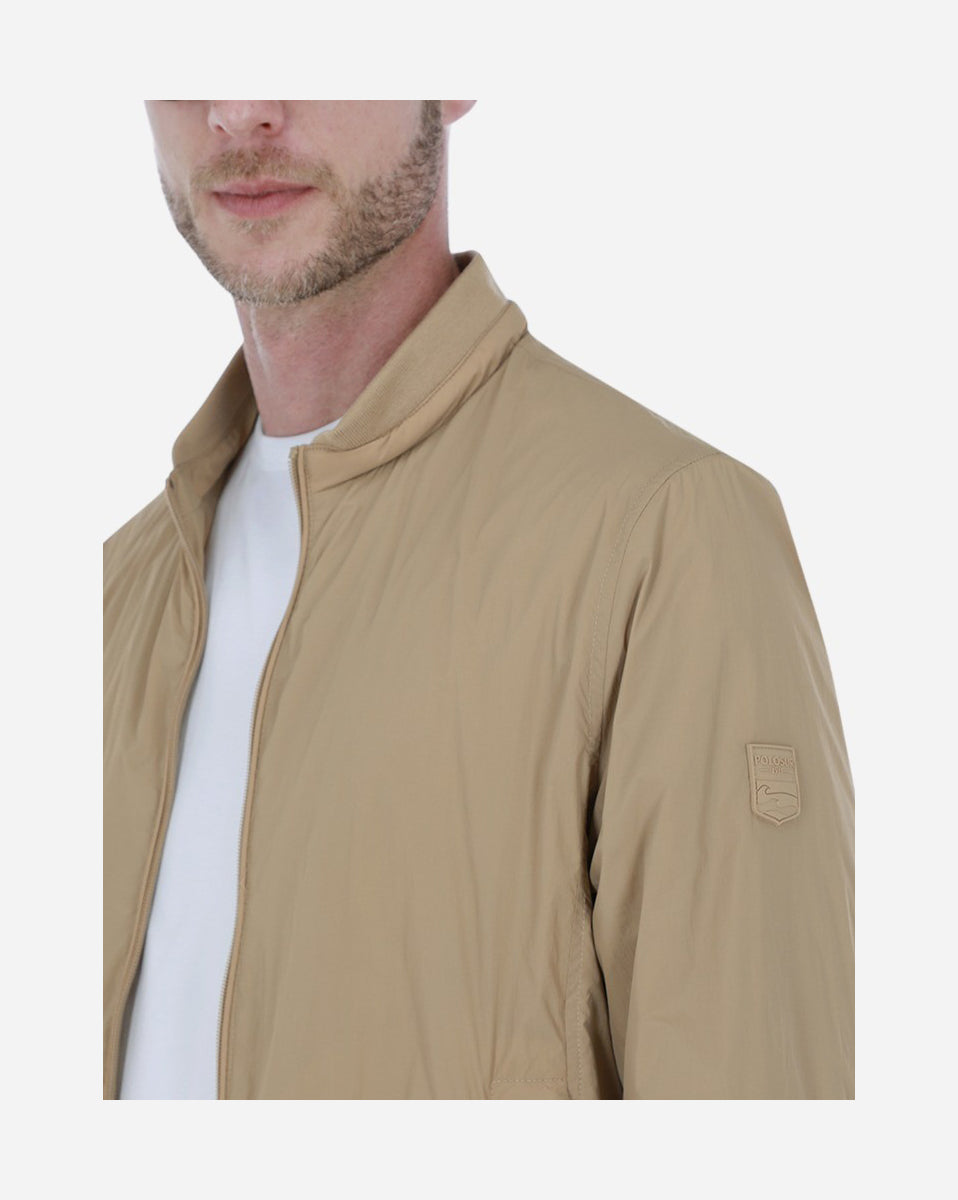 Chamarra 100% poliamida estilo bomber con elástico en cuello, puños y fondo al tejido base. Forro jersey 100% algodón en gris. Detalle de parche de goma a tono en manga izquierda. Prenda fresca e ideal para el verano.