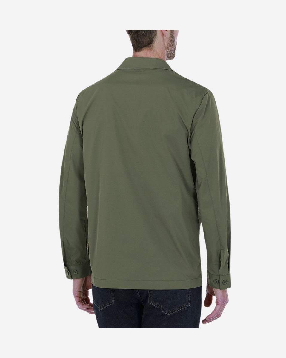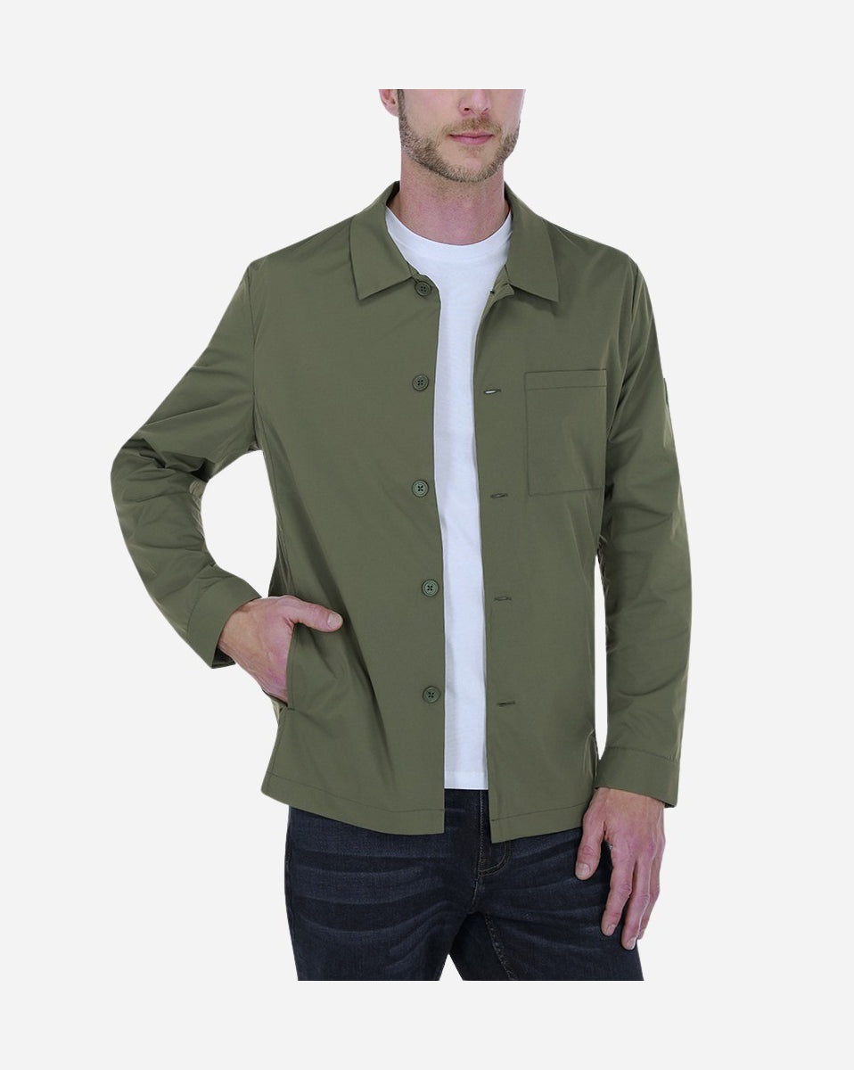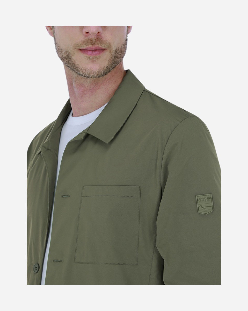Chamarra 100% poliéster, regular fit estilo sobrecamisa. Cuello y puños camiseros. Bolsa en pecho. Detalle de parche de goma a tono en manga izquierda. Tejido ultra ligero, puedes.