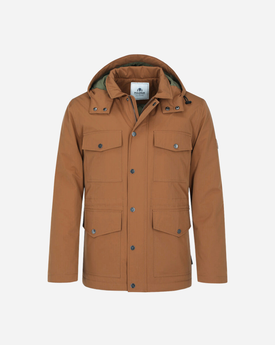 Chamarra Regular Fit 100% poliéster. Diseño funcional y estilo utilitario, en color ocre. Cuenta con múltiples bolsas al frente con solapa y una capucha desmontable, ajuste en la parte de la cintura interna, capitonado interno en contraste. Corte y confección que brindan protección, comodidad y practicidad para el día a día.